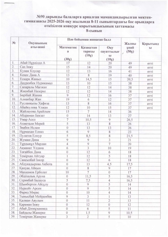 №90 ДБАМ мектеп-гимназия » Ақпарат » №90 дарынды балаларға арналған мамандандырылған мектепгимназиясы 2025-2026 оқу жылында 8-11 сыныптардағы бос орындарға өткізілген конкурс қорытындысының хаттамасы
