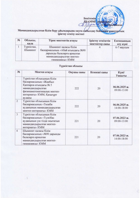 26 май 2025 0 1 2 3 4 5 Мамандандырылған білім беру ұйымдарына оқуға қабылдау бойынша конкурстық іріктеу өткізу кестесі