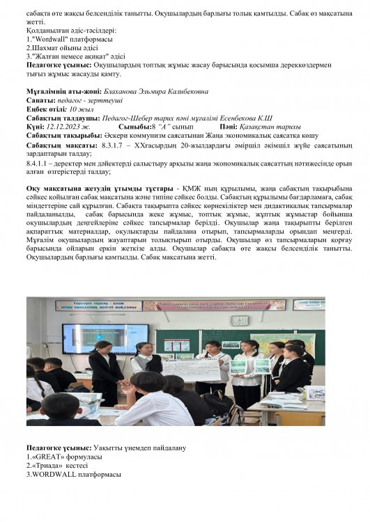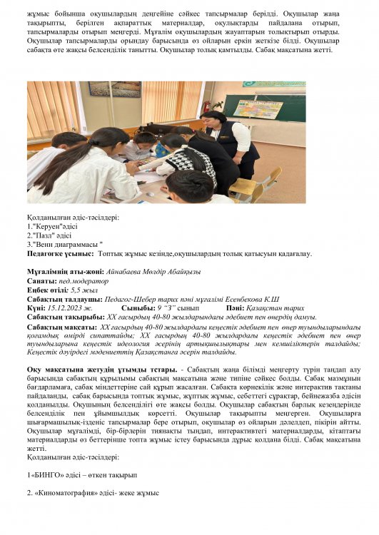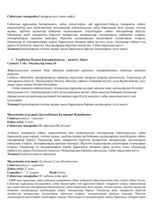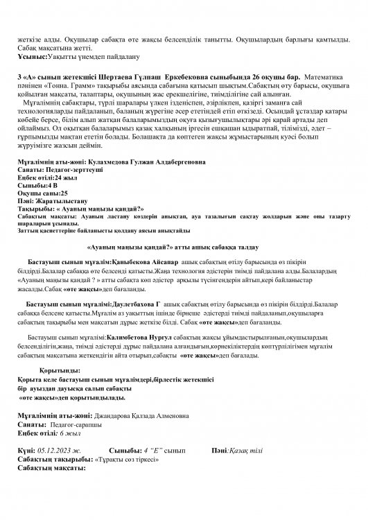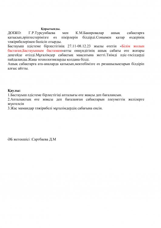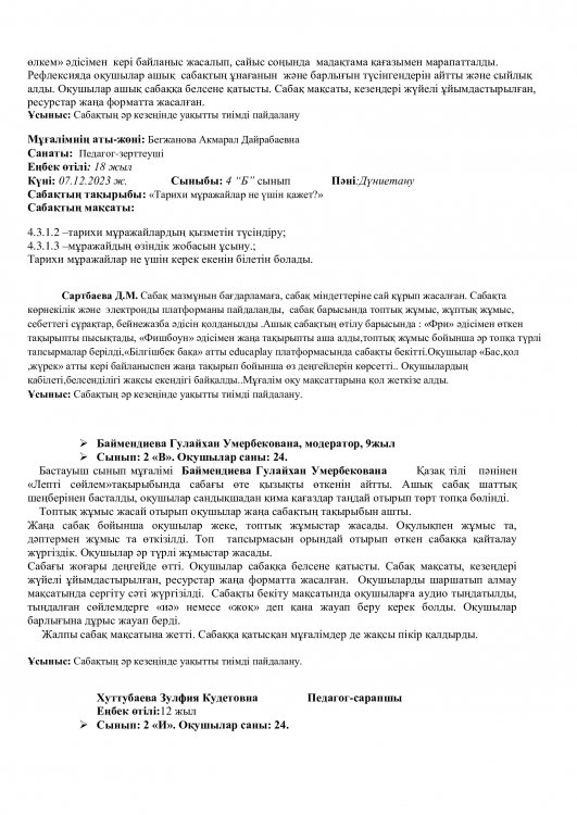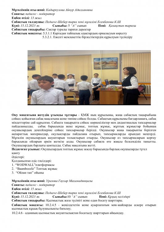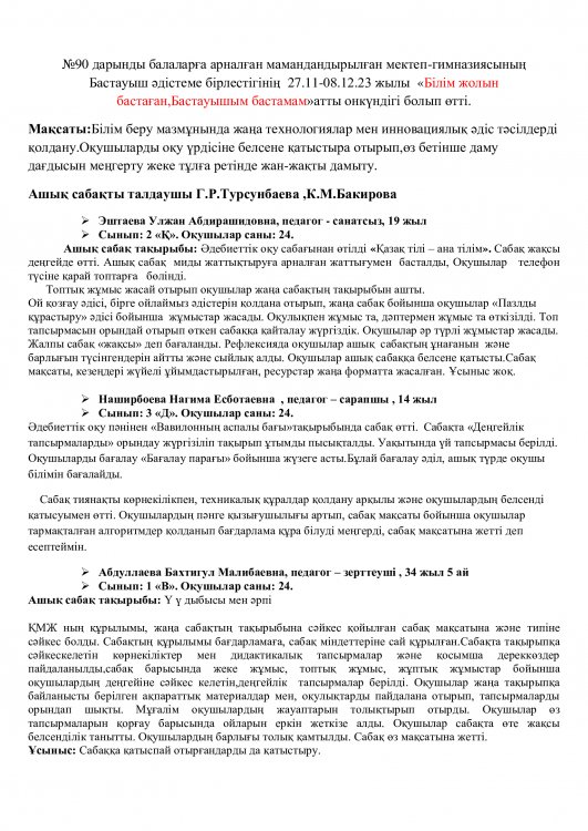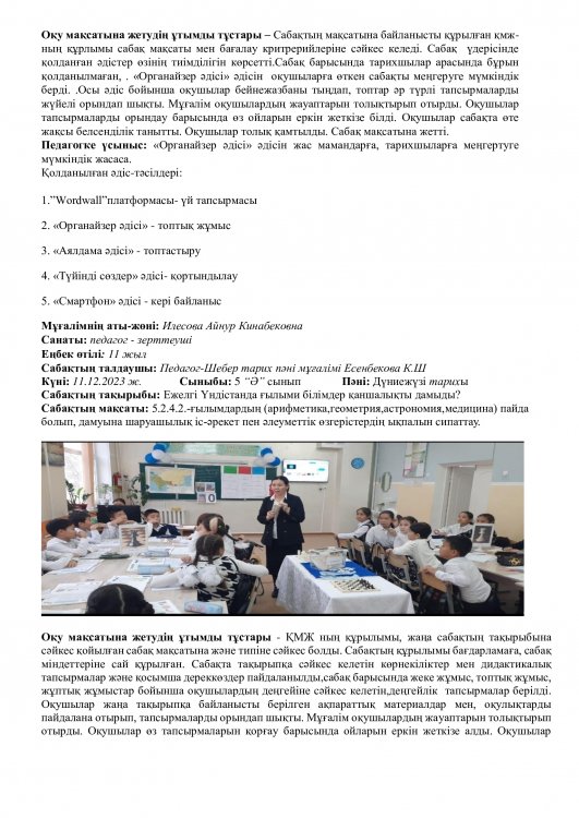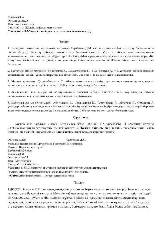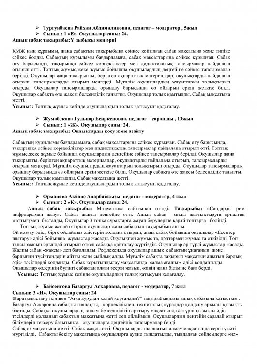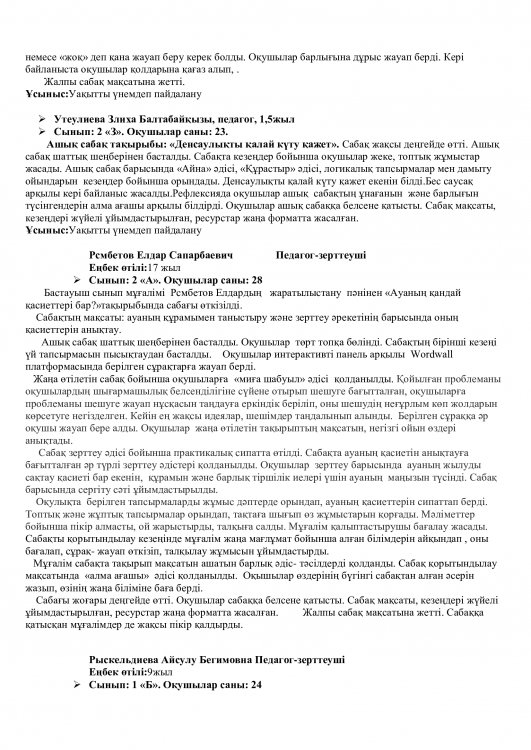 Онкүндік барысында  өткізілген сабақтардың барлығы дерлік жоғары деңгейде өткізіліп сабаққа басқа пән мұғалімдері де қатысып өте жақсы деген баға берді.