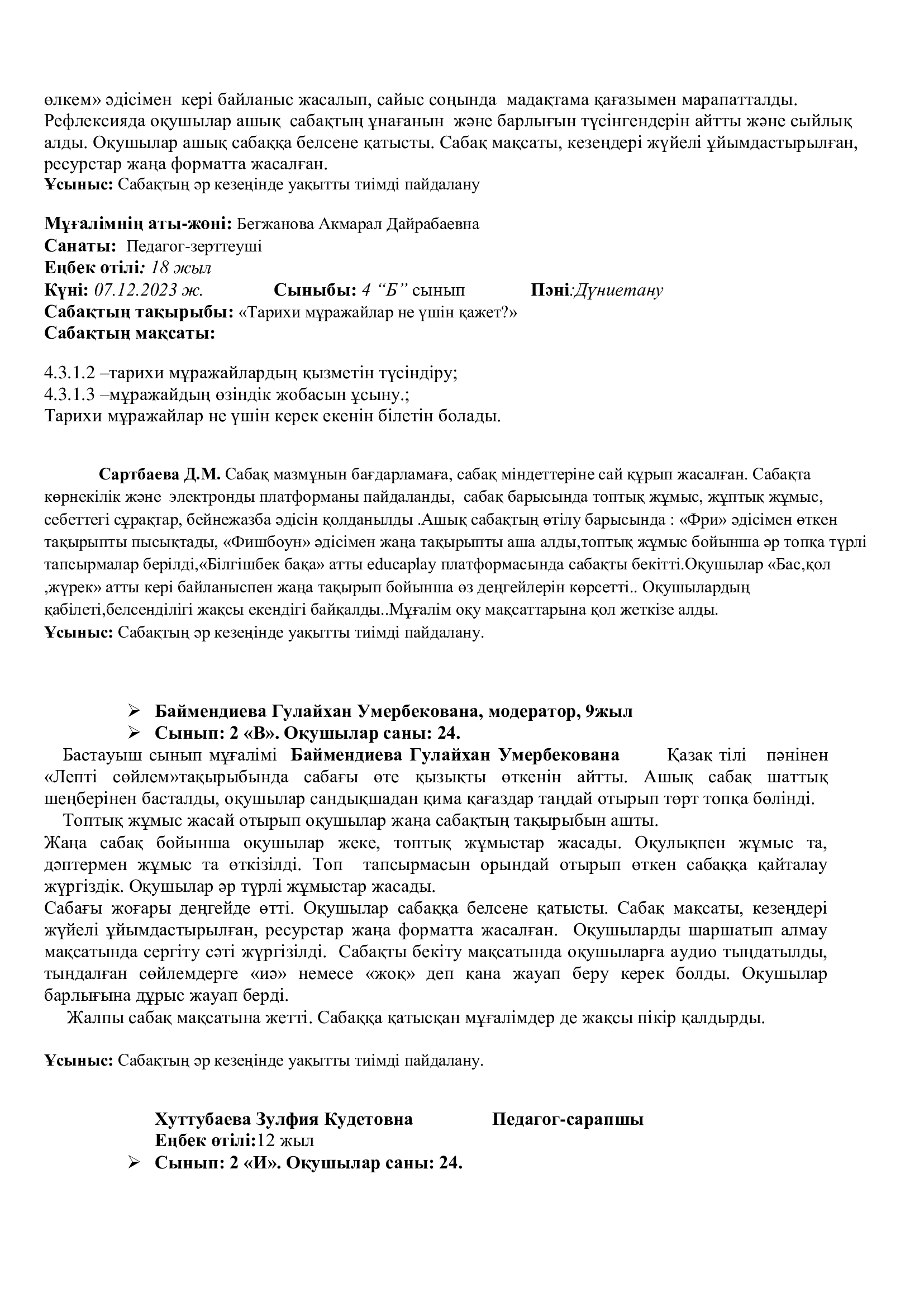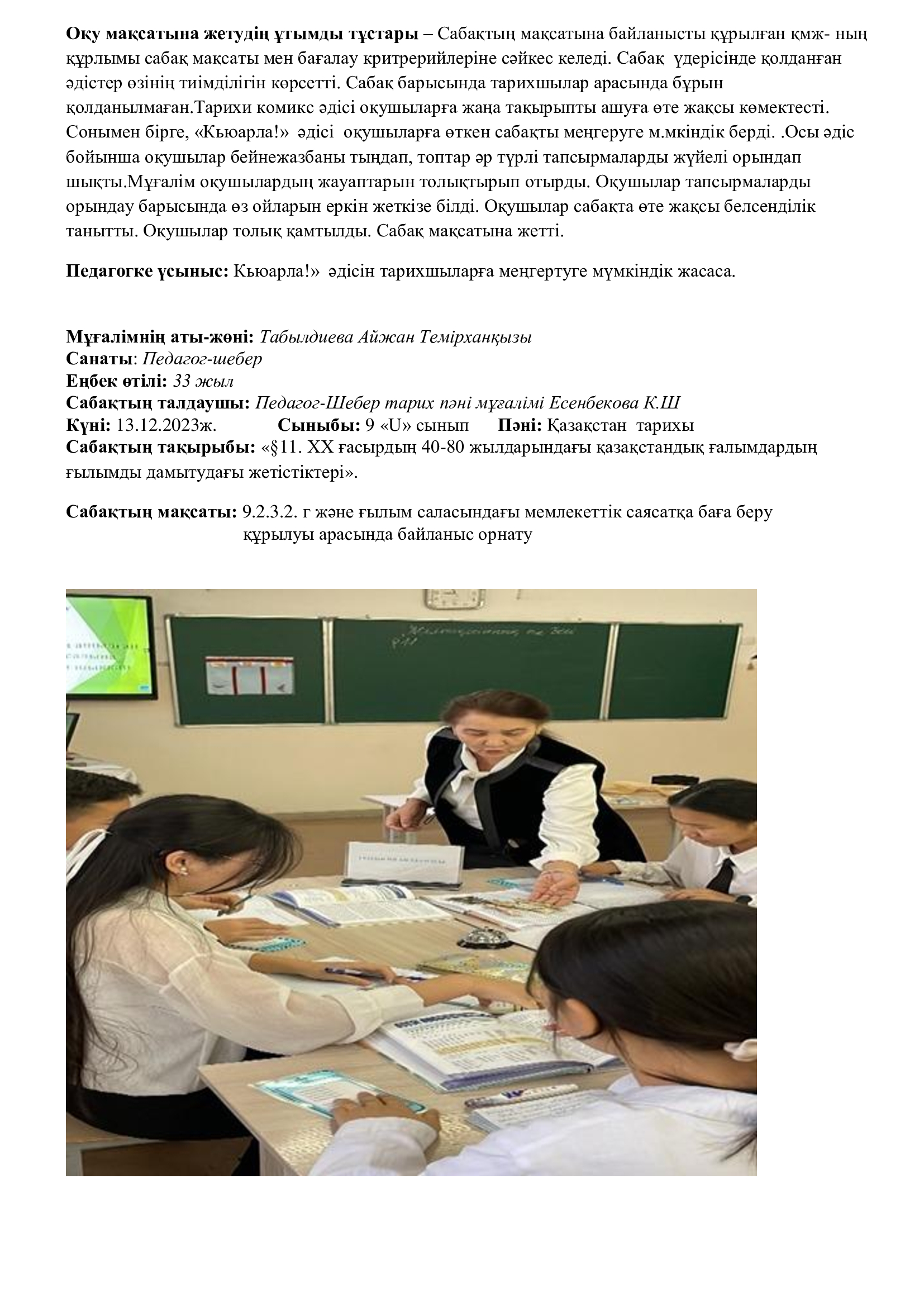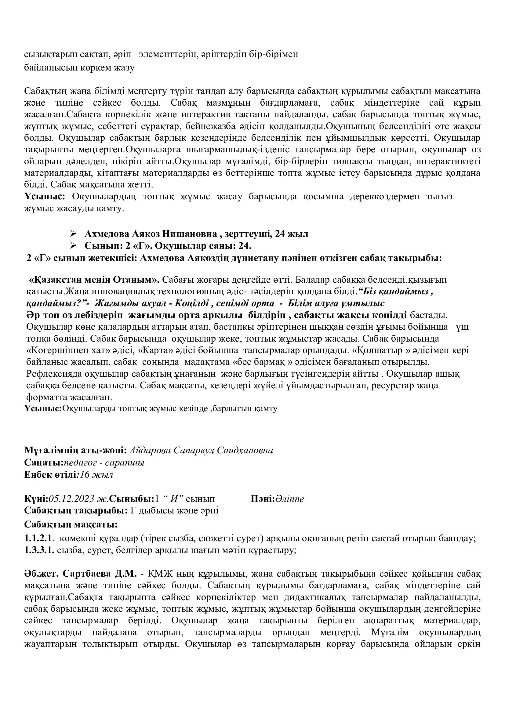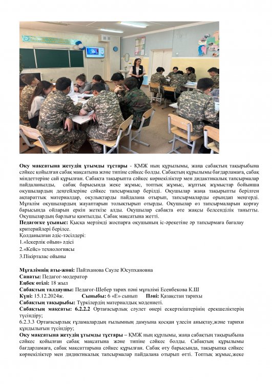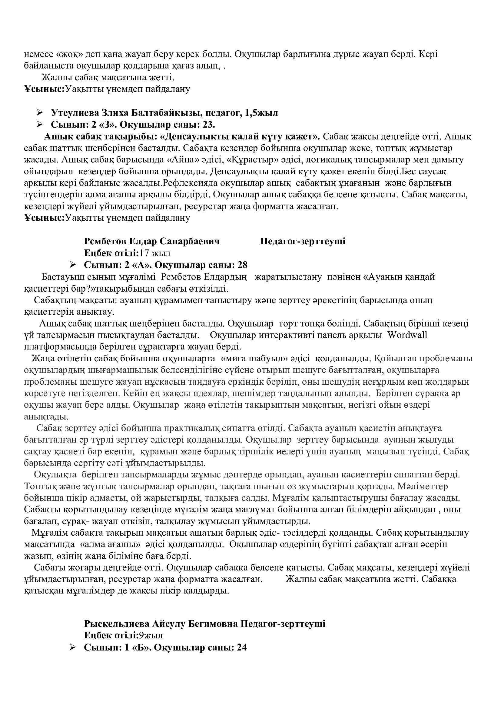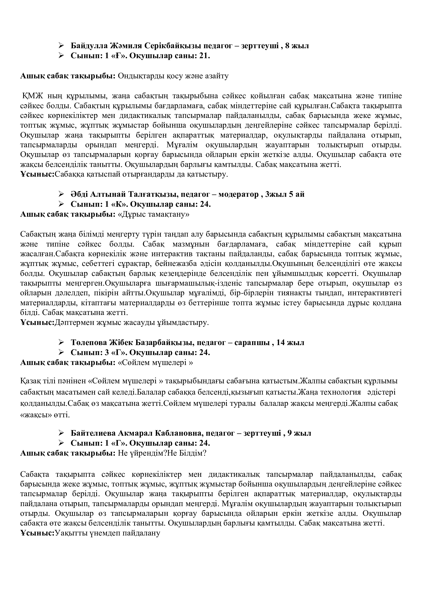 Онкүндік барысында  өткізілген сабақтардың барлығы дерлік жоғары деңгейде өткізіліп сабаққа басқа пән мұғалімдері де қатысып өте жақсы деген баға берді.