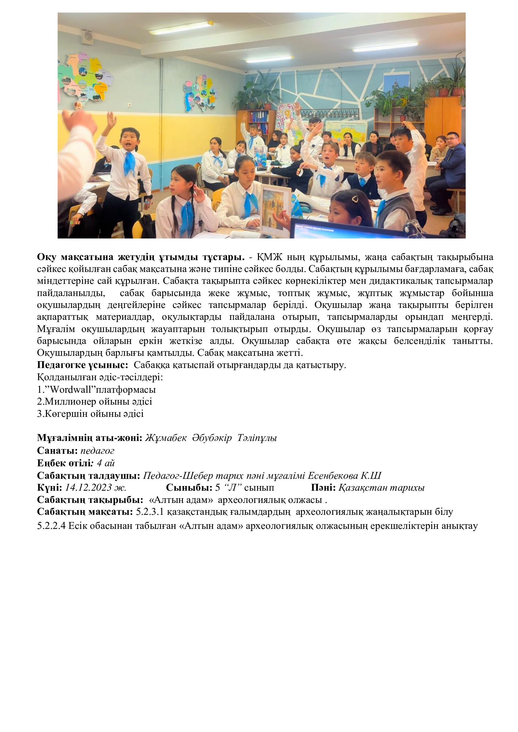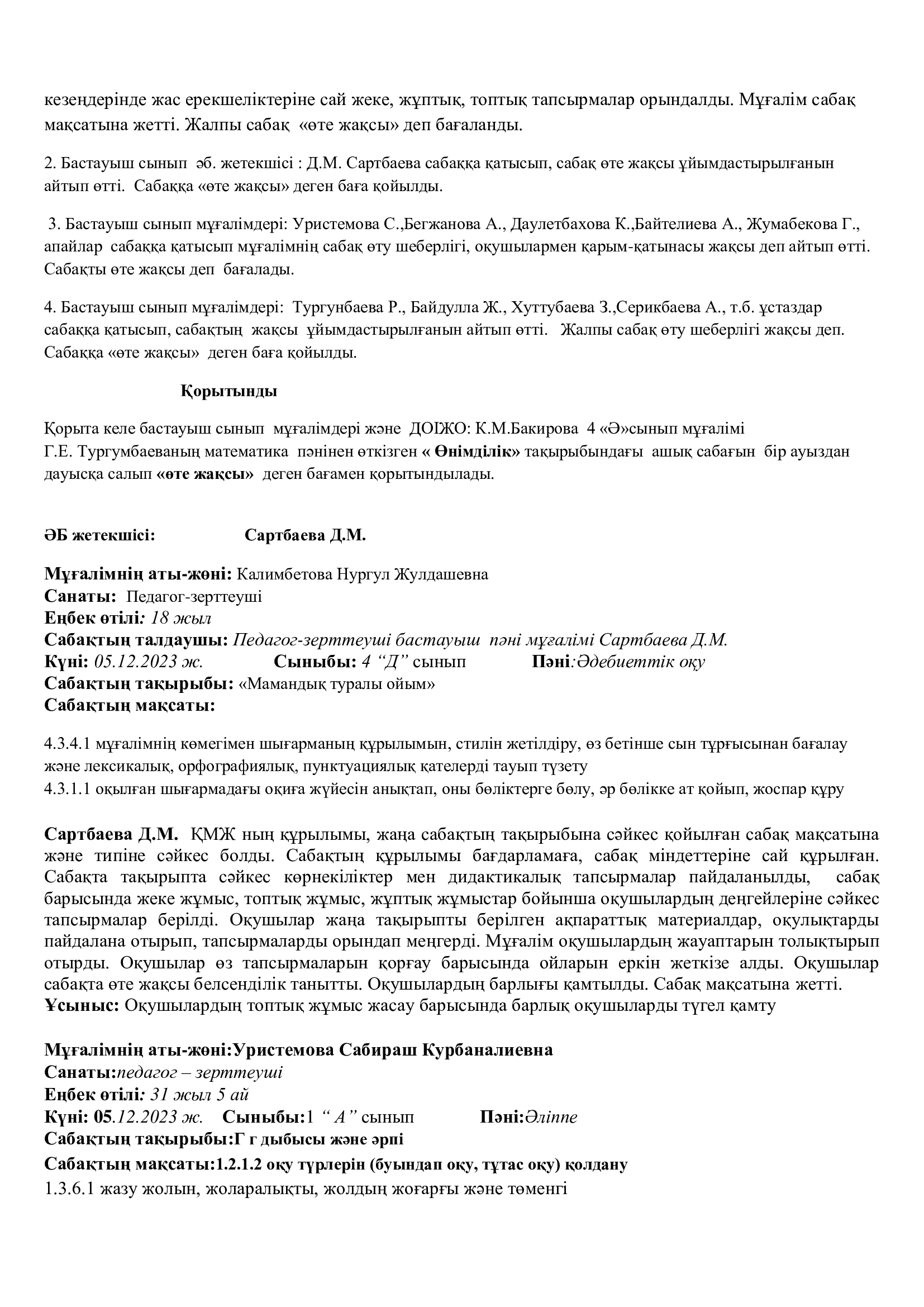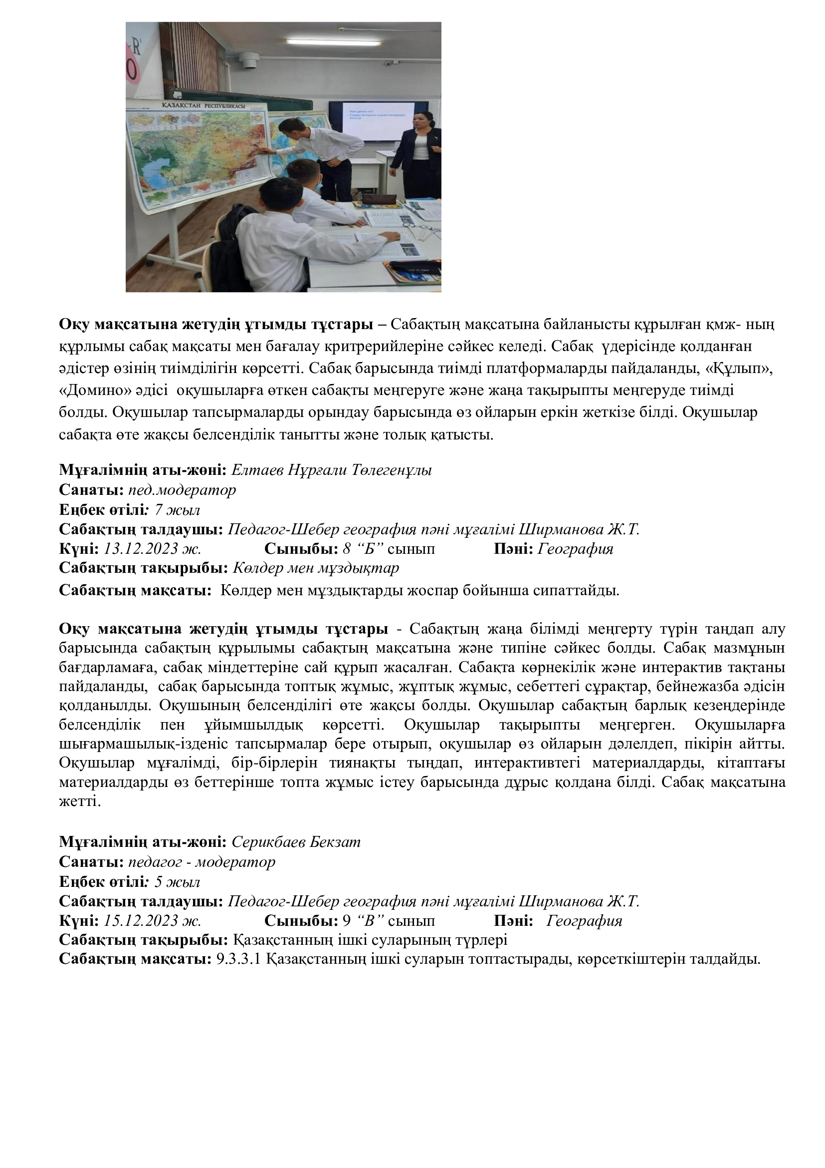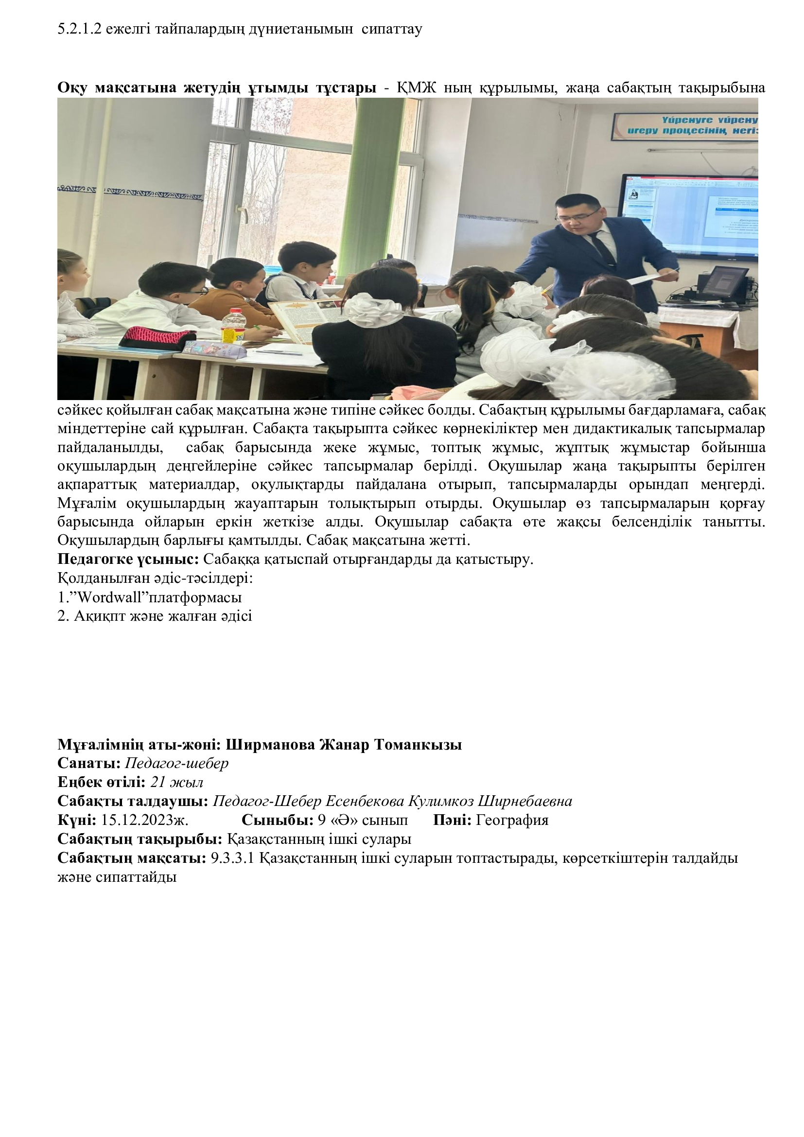 Онкүндік барысында  өткізілген сабақтардың барлығы дерлік жоғары деңгейде өткізіліп сабаққа басқа пән мұғалімдері де қатысып өте жақсы деген баға берді.