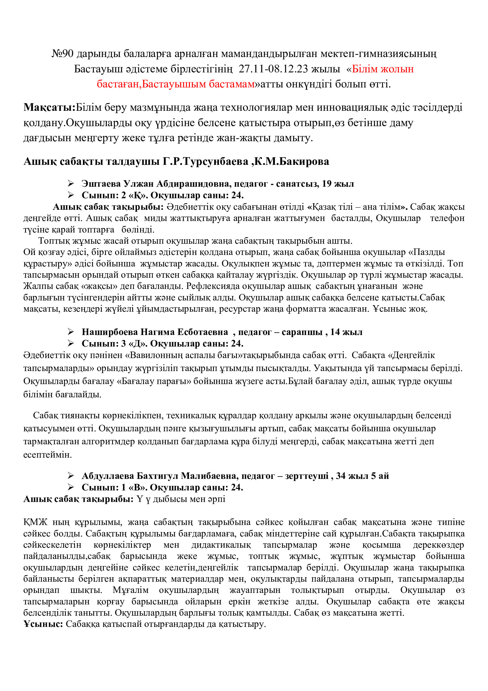 Бастауыш сынып бірлестігінің онкүндік есебі