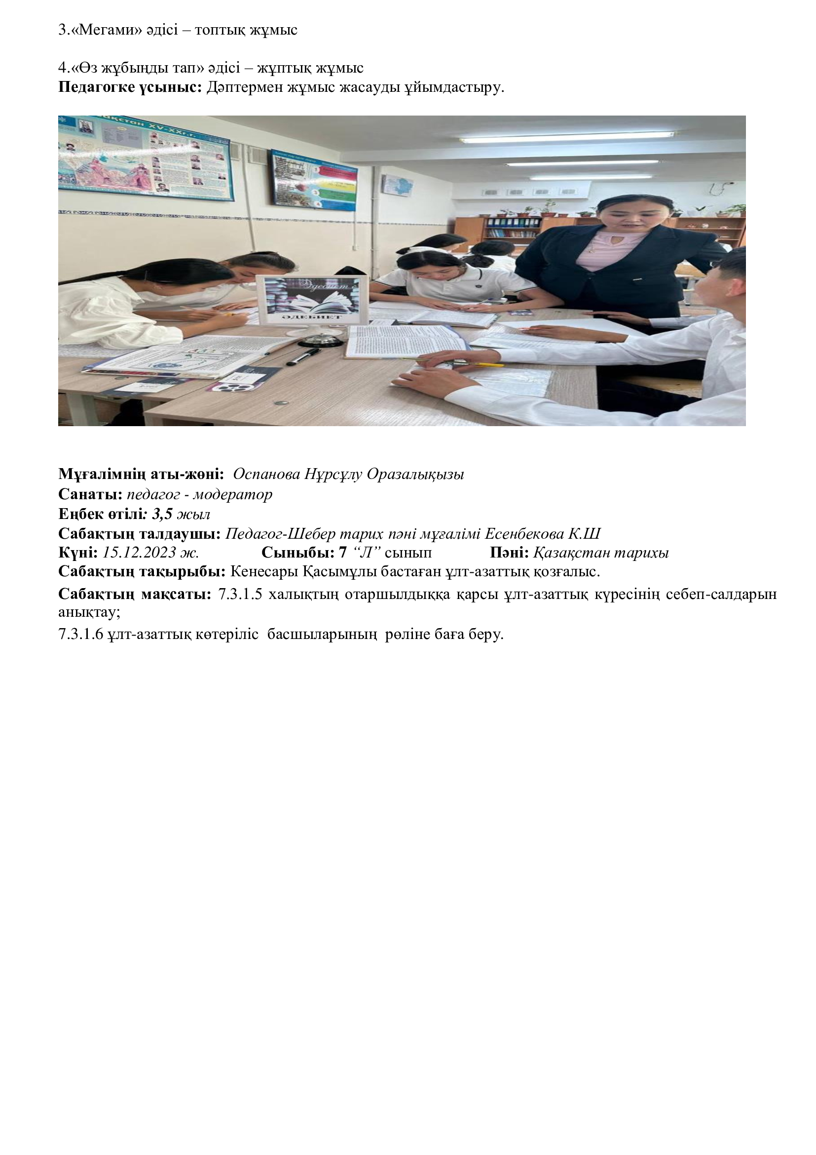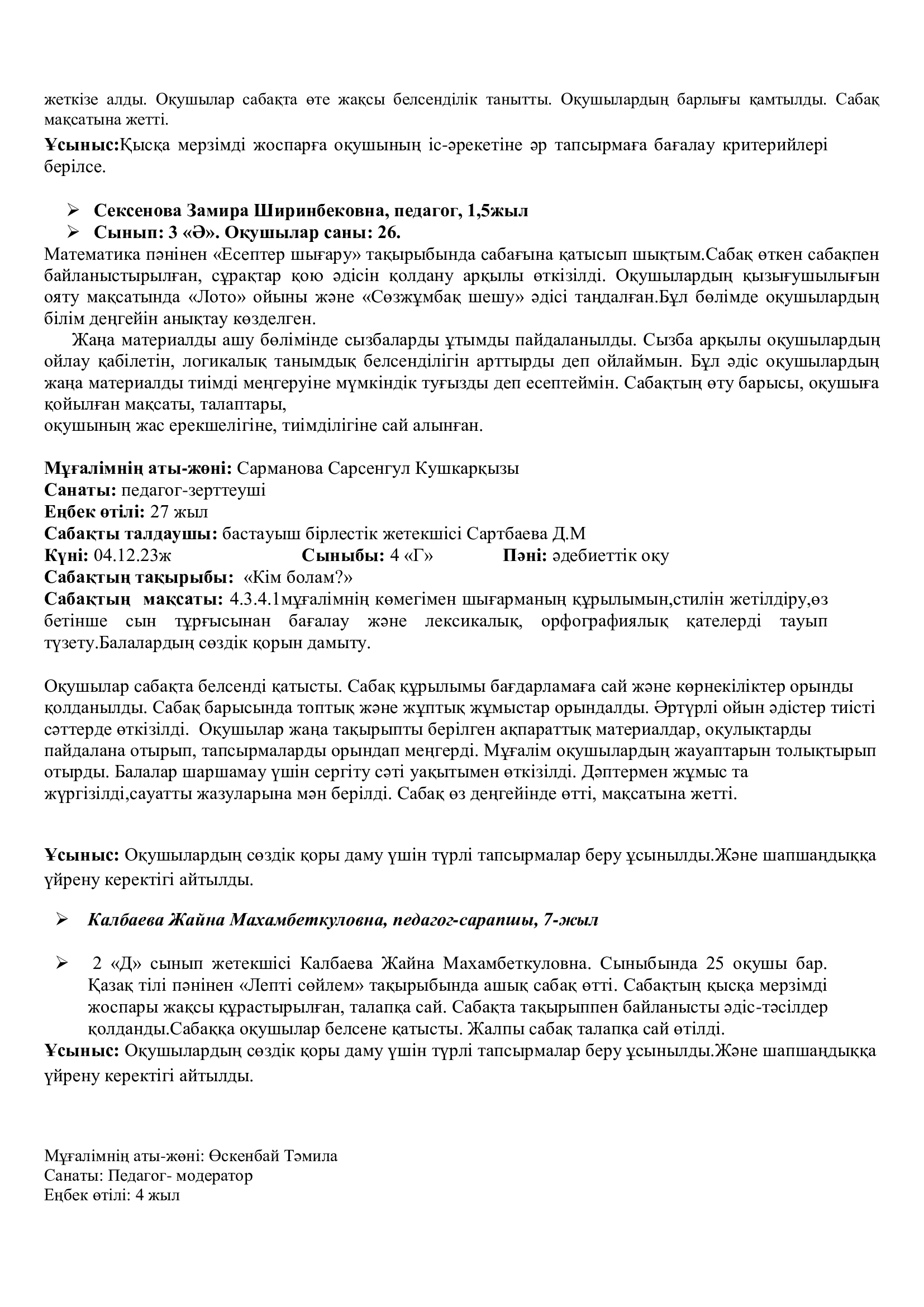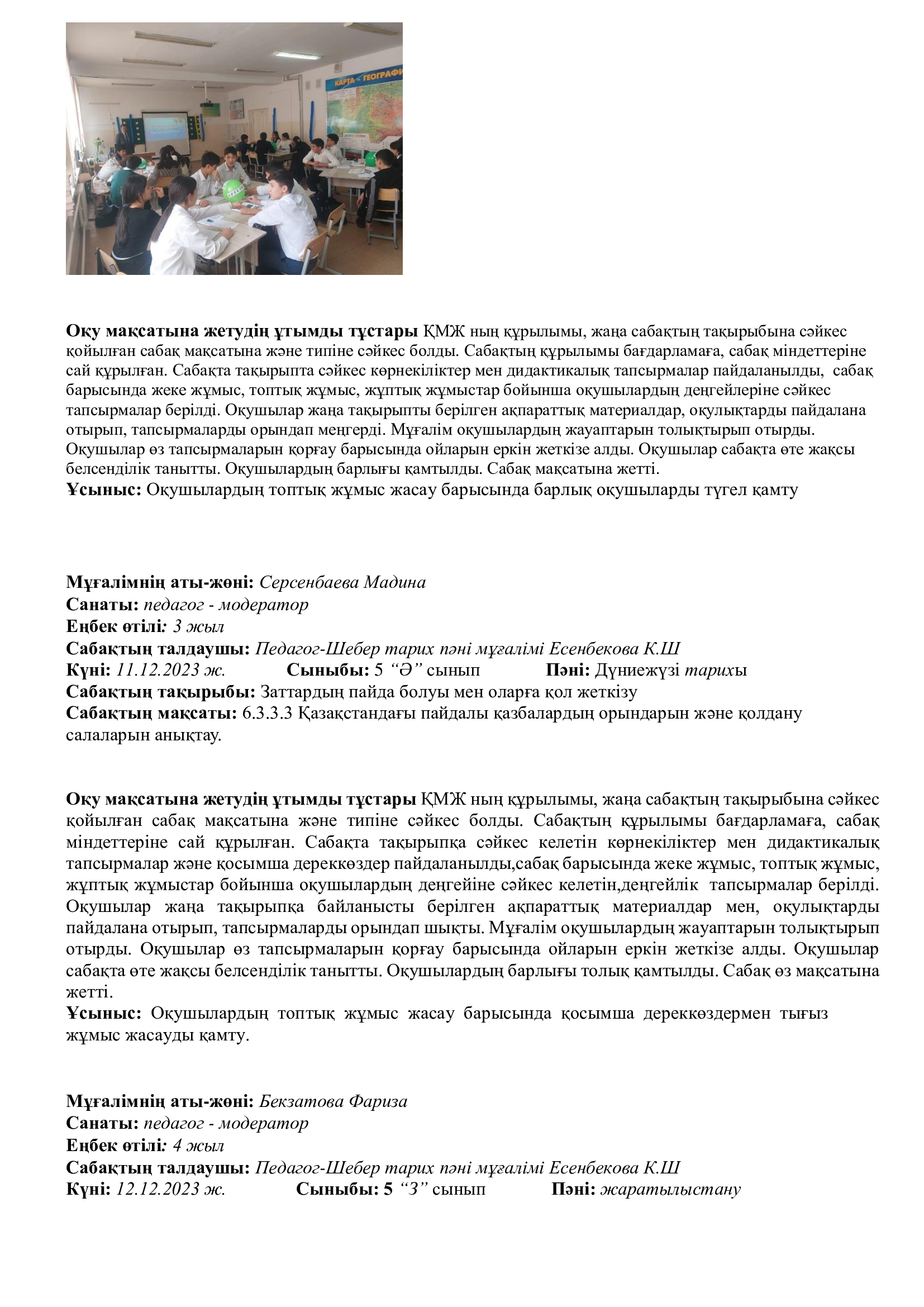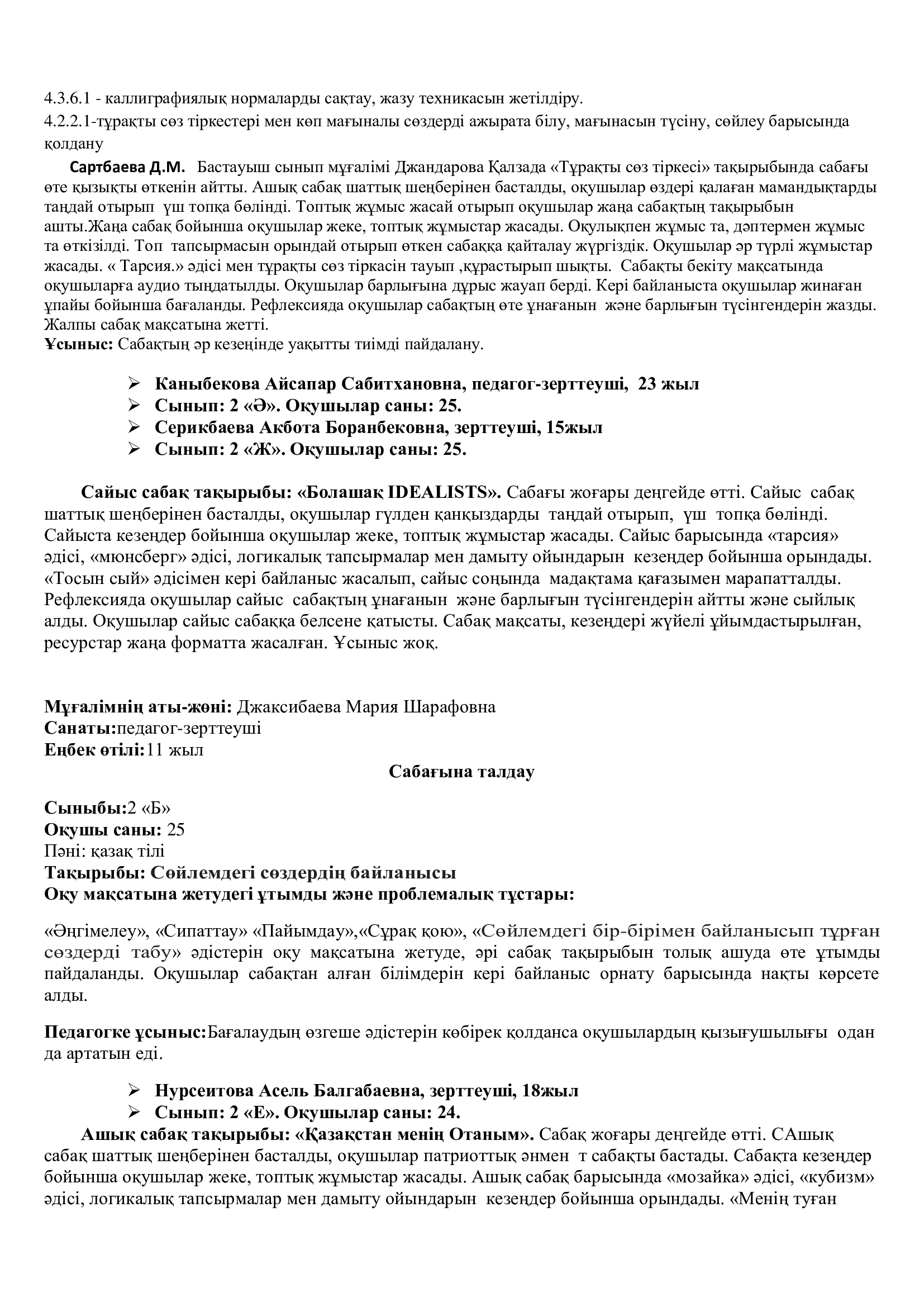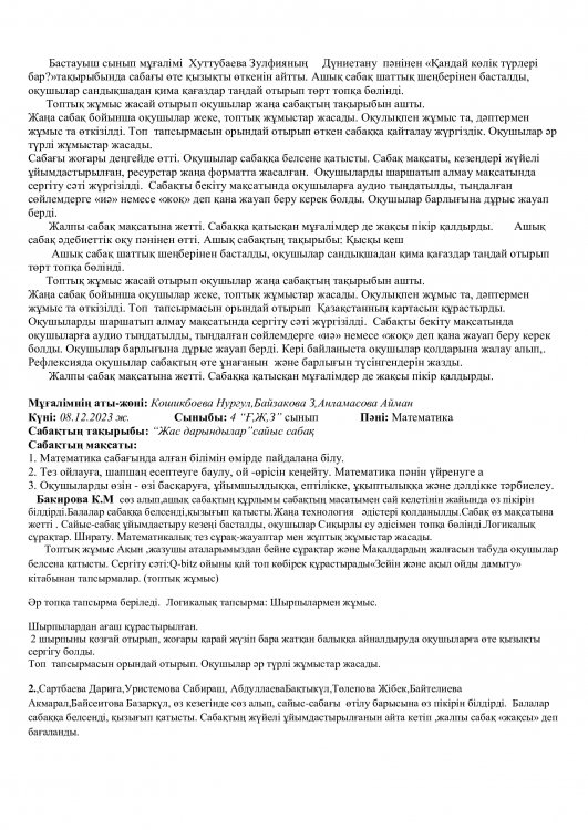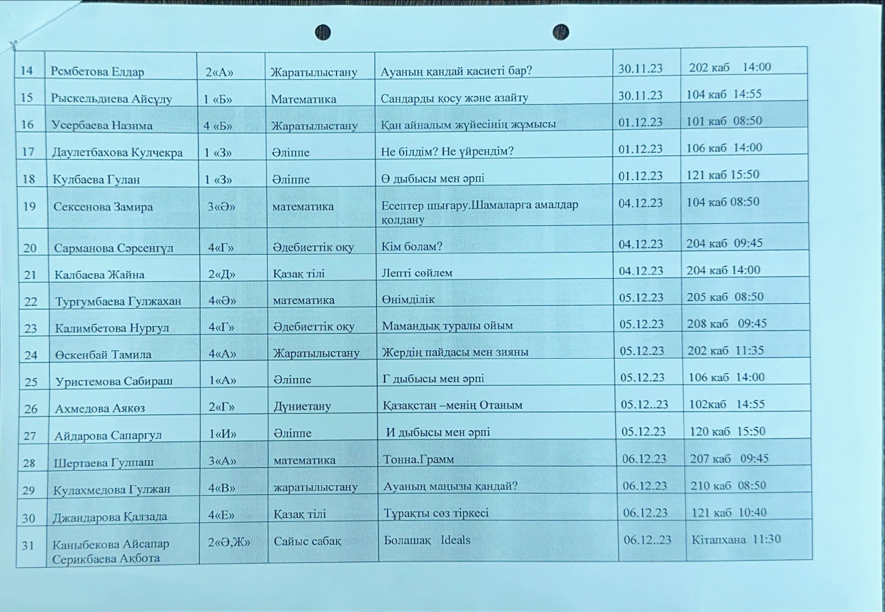 Сондай -ақ, біздің кафедраның өміріне жаңа толқын әкелген біздің жас мамандар өздерін көрсете білді - бұл Қамбарбекова Айнұр  6 «А» сыныбымен  Оң сандар. Теріс сандар. Координаталық түзу. Қарама-қарсы сандар, тақырыбында ашық сабаққа балалар жас ерекшелігін ескере отырып өте жақсы деңгейде дайындықпен сабақ өткізді. Қамбарбекова Айнұр  мен Атымтаев Хусан оларға шығармашылық  батылдық пен кәсіби өсуді тілейміз.