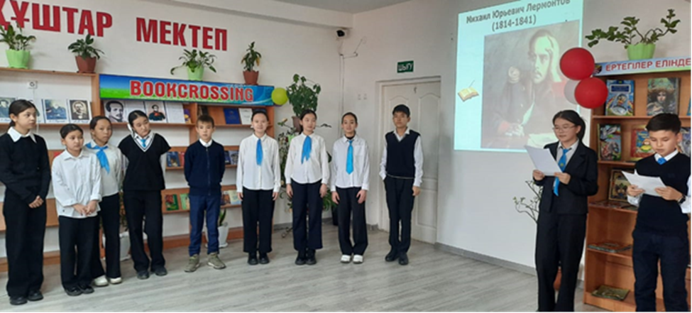 Шымкен қаласы ҚББ-на қарасты N90 Дарынды балаларға арналған мамандандырылған мектеп-гимназия кітапханасында Кітапханашылар мен орыс тілі пән мұғалімі Р.Шахабаева "Оқуға құштар мектеп" жобасы аясында орыстың атақты ұлы ақыны Лермонтов Михаил Юрьевичті еске алу. (1814-1841) оның лирикалық поэзияны дамытудағы еңбегі қандай зор болса,көркем прозаны дамытудағы еңбегі соншалық зор. Лермонтов өлеңдері жас кезінде Москва университетінің пансионатында оқып жүргенде жаза бастаған. Лермонтов 300 дей өлең, 16 поэма, 3 драмалық шығарма жазған. Қазақтың ұлы ақыны Абай атамыз Лермонтовты тек оқып қоймай,өлеңдерін аудару мен ғана шектелген жоқ.Абайдың Лермонтов поэзиясына деген ықыласы ерекше еді. Бүгінгі ұйымдастырған іс-шарамыздың мақсаты аз ғұмырын өлеңге арнап, осы біздің жас ұрпақтарымыздың жадында екендігін дәлелдеді. Лермонтов өлеңдерін жатқа айтып берген оқушыларымыз орыс ақыны жайында көптеген мағлұматтарға қанықты.